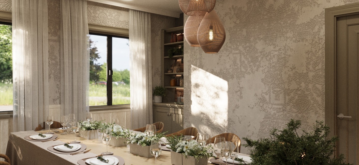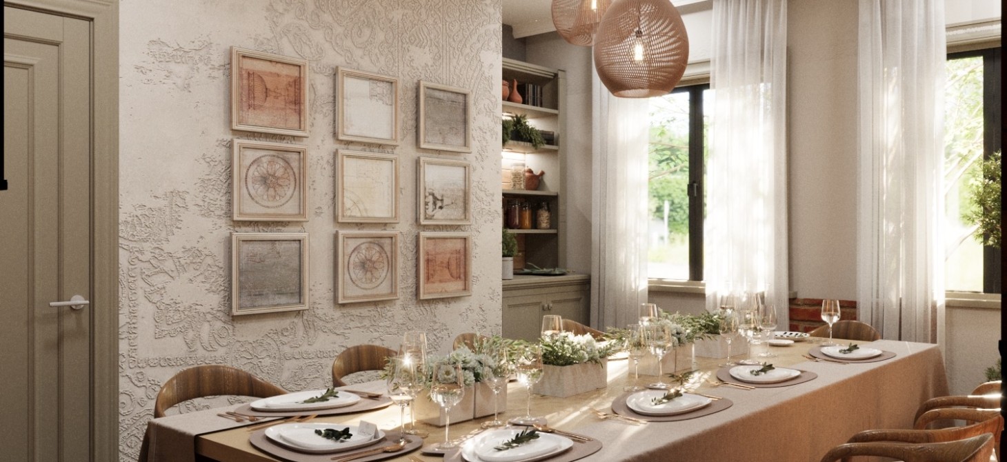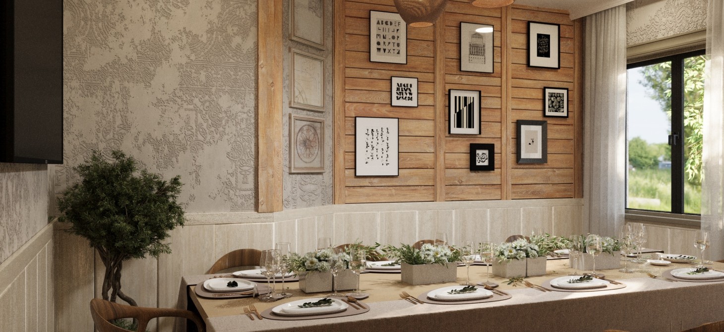✨ Dining Halls – Light-filled dining areas feature soft earthy tones, textured walls, and natural wood accents. Decorative panels and curated wall art add personality while maintaining a sophisticated balance.